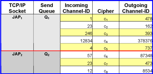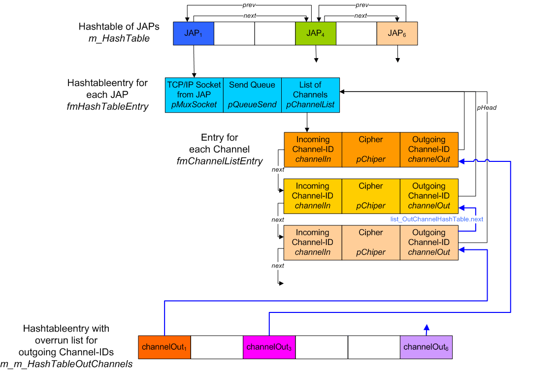 There exists a Hashtable ((m_HashTable ) of all TCP/IP connections from JAPs, where each TCP/IP connections represents exactly one JAP. The SOCKET identifier of such a TCP/IP connection is used as Hashkey. The elements of this Hashtable are of the type fmHashTableEntry. In order to travers the TCP/IP connections from all JAPs, each Hashtableentry stores a pointer (next) to the next (non empty) Hashtableentry, thus forming a linked list (actually it is a double linked list). Each Hashtableentry stores a reference to the belonging TCP/IP socket object (pMuxSocket), to a Queue used for storing the data which has to be send to the JAP (pSendQueue) and a pointer (pChannelList) to a List of Channels belonging to the JAP. Each entry of the Channellist stores a reference (pCipher) to the Cipher object used for en-/decryption of the MixPackets belonging to the MixChannel, the incoming (channelIn) and outgoing (channelOut) Channel-ID. Also each Channellistentry contains a reference (pHead) to the belonging Hashtableentry. In order to traverse all Channels which belong to a JAP, the Channels are organised in a double linked list. The elements list_InChannelPersocket.next and list_InChannelPersocket.prev could be used to traverse the Channels. This way the Mix could find the outgoing Channel-ID (and Cipher) if he receives a MixPacket from a JAP. (Note that the Mix already knows the HashtableEntry, because he has read the MixPacket from the belonging Socket).