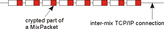 The stream of MixPackets between to mixes is encrypted using AES-128/128 in OFB-128 mode. Exactly only the first part (16 bytes) of each MixPacket is encrypted. (see Figure 4)
