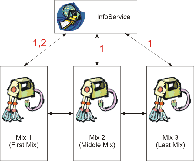 The local proxy (JAP) and the mix servers communicate using TCP/IP-Internet connections. Each JAP has one and only one connection to a mix server. A mix server has one and only one connection to one or two other mixes. If a mix receives data packets from JAP's and sends them to an other mix, we call them a first mix. So a first mix has exactly one connection to an other mix. If a mix receives packets from a mix and sends the data to the cache proxy, we call them the last mix. Consequently a last mix has only one connection to an other mix. Each mix with two connections to other mixes is called a middle mix. This type of mix will receive packets form one mix and forwards them to the other mix.