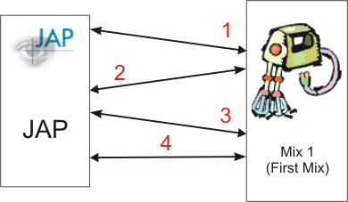 JAP acts as a local proxy for the browser. The browser opens many connections to the JAP (usually one per HTTP-Request). All this connections are multiplexed over the one connection to the first mix JAP is connected to. Every connection from the browser is called a channel (mix channel or AnonChannel). A first mix sends the stream of packets (from multiple channels) from multiple users to the next mix (all over one TCP/IP connection). So JAP and the mixes have to multiplex/demultiplex the channels. A channel can transport only fixed sized packets. These packets are called MixPackets. So a first mix for instance gets many packets from different users in parallel and sends them to the next mix in a serialized way. (see Figure 2)